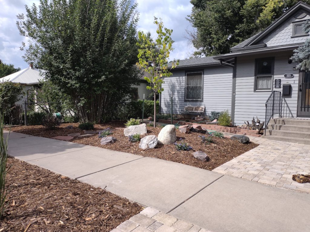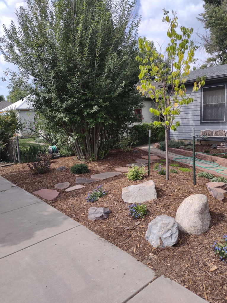 Rather than grass, low-water use plants, a new tree, and mulch cover the area.